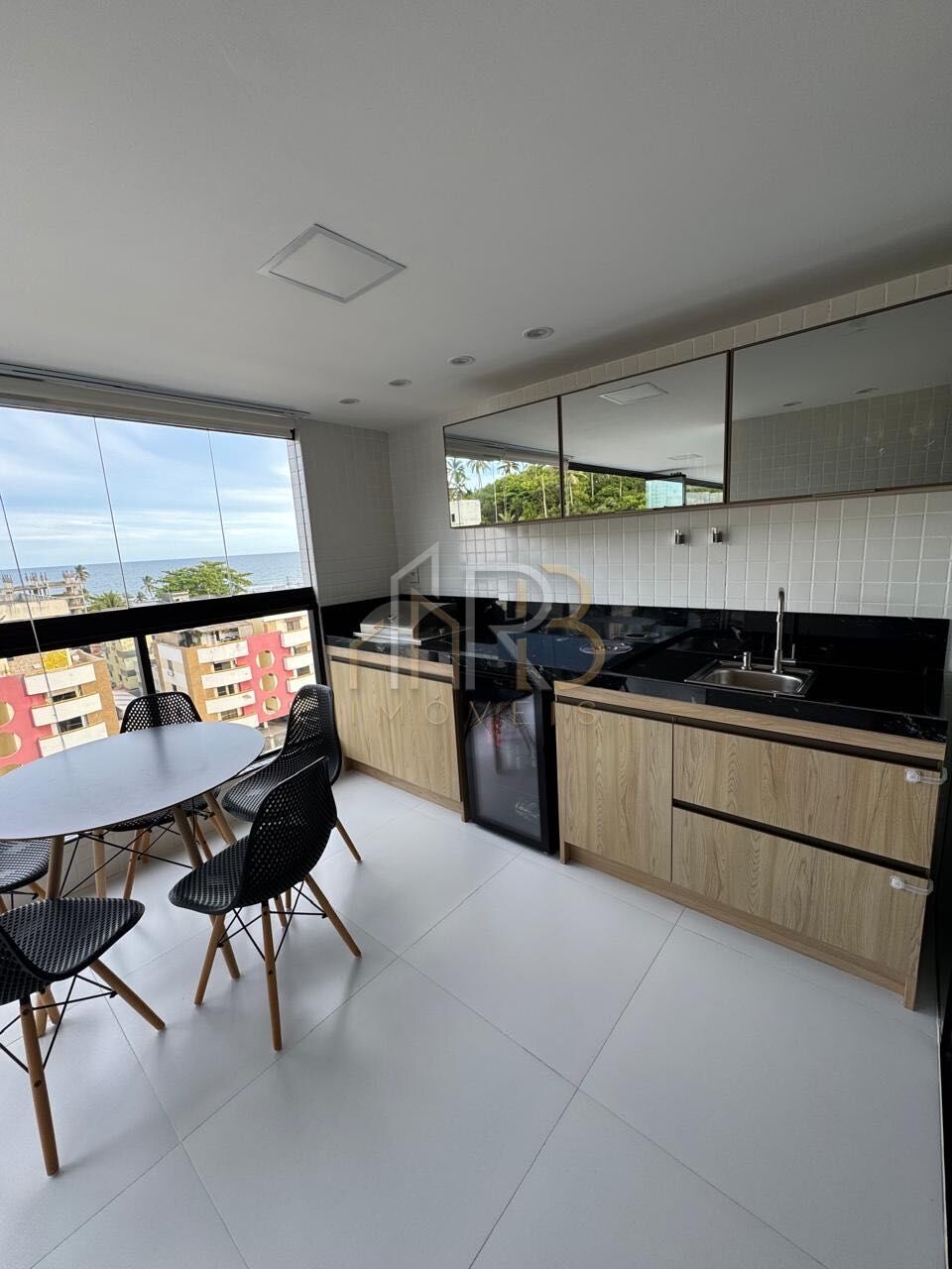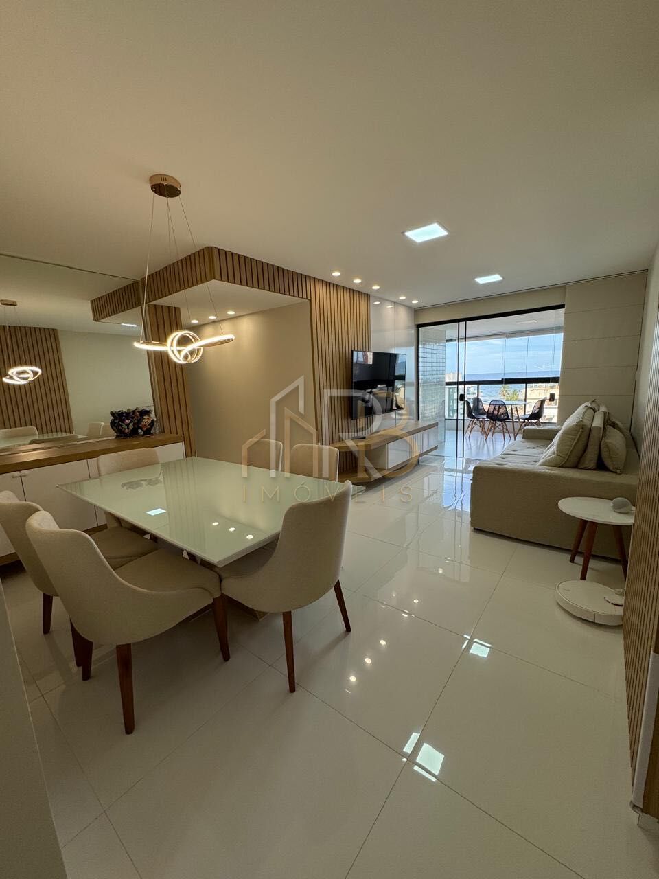 Apartamento frontal mobiliado com 105m2 de área útil, 2 vagas de garagem, 3 suítes, banheiro social, varanda gourmet com churrasqueira e cortina de vidro, sala de estar, sala de jantar, cozinha e área de serviço.