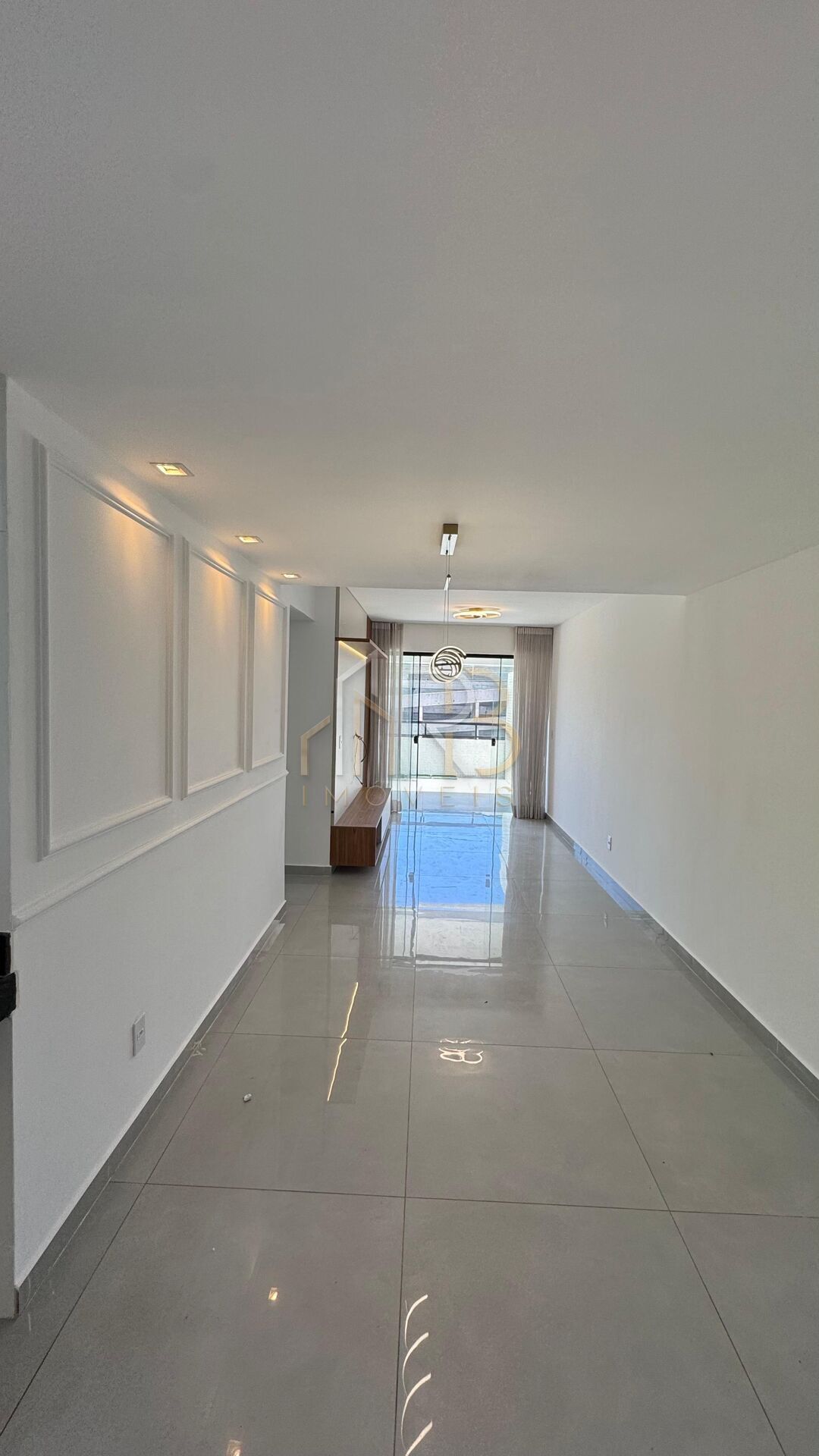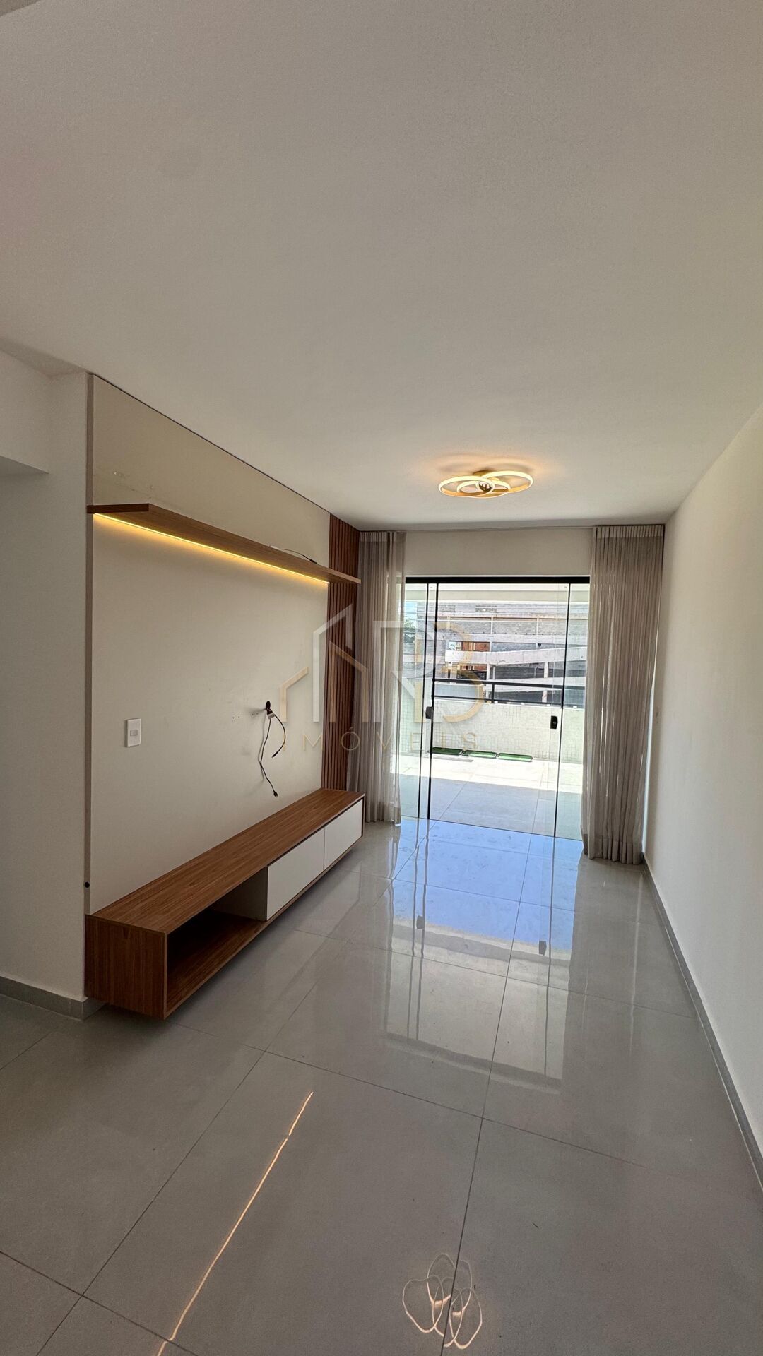 •Sala com painel para TV e luminárias